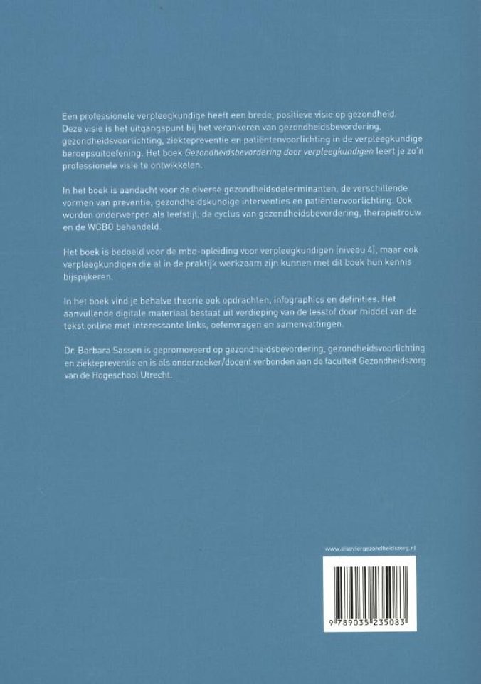 In het boek is aandacht voor de diverse gezondheidsdeterminanten, de verschillende vormen van preventie, gezondheidskundige interventies en patiëntenvoorlichting. Ook worden onderwerpen als leefstijl, de cyclus van gezondheidsbevordering, therapietrouw en de WGBO behandeld.