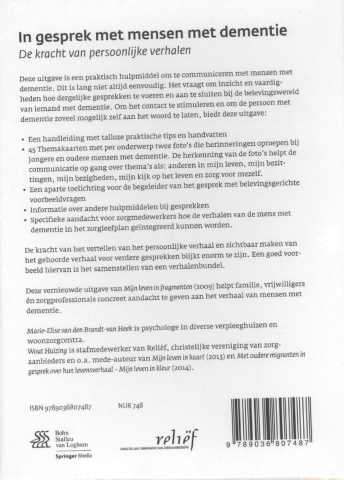 Deze uitgave is een praktisch hulpmiddel om te communiceren met mensen met dementie. Dit is lang niet altijd eenvoudig. Het vraagt om inzicht en vaardigheden hoe dergelijke gesprekken te voeren en aan te sluiten bij de belevingswereld van iemand met dementie. Om het contact te stimuleren en om de persoon met dementie zoveel mogelijk zelf aan het woord te laten, biedt deze uitgave: * Een handleiding met talloze praktische tips en handvatten * 45 Themakaarten met per onderwerp twee foto's die herinneringen oproepen bij jongere en oudere mensen met dementie. De herkenning van de foto's helpt de communicatie op gang over thema's als: anderen in mijn leven, mijn bezittingen, mijn bezigheden, mijn kijk op het leven en zorg voor mezelf. * Een aparte toelichting voor de begeleider van het gesprek met belevingsgerichte voorbeeldvragen * Informatie over andere hulpmiddelen bij gesprekken * Specifieke aandacht voor zorgmedewerkers hoe de verhalen van de mens met dementie in het zorgleefplan geïntegreerd kunnen worden. De kracht van het vertellen van het persoonlijke verhaal en zichtbaar maken van het gehoorde verhaal voor verdere gesprekken blijkt enorm te zijn. Een goed voorbeeld hiervan is het samenstellen van een verhalenbundel. Deze vernieuwde uitgave van Mijn leven in fragmenten (2009) helpt familie, vrijwilligers én zorgprofessionals concreet aandacht te geven aan het verhaal van mensen met dementie. Marie-Elise van den Brandt- van Heek is psychologe in diverse verpleeghuizen en woonzorgcentra. Zij is ontwikkelaar van deze werkwijze en medeauteur van Mijn leven in fragmenten (2009). Wout Huizing is stafmedewerker van Reliëf, christelijke vereniging van zorgaanbieders en o.a. mede-auteur van Mijn leven in kaart(2013) en Met oudere migranten in gesprek over hun levensverhaal - Mijn leven in kleur(2014).