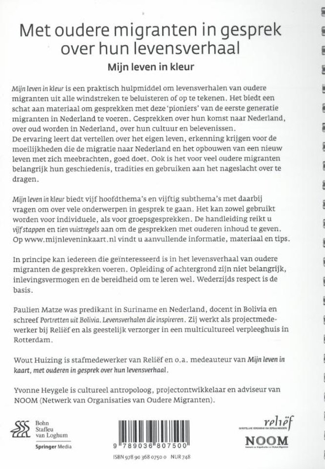 Met oudere migranten in gesprek over hun levensverhaal, mijn leven in kleur, is een hulpmiddel voor het luisteren naar levensverhalen van oudere migranten . Hiermee bedoelen we ouderen vanaf ongeveer 55 jaar van niet-Nederlandse afkomst , bijvoorbeeld met een Indische, Surinaamse, Turkse, Molukse, Marokkaanse, Antilliaanse, Spaanse, Chinese of voormalige Joegoslavische achtergrond. Oudere migranten zijn cultureel en levensbeschouwelijk gezien een zeer diverse doelgroep en niet zomaar onder één noemer te brengen . Desondanks hebben ze veel gemeenschappelijk : niet alleen hun vaak kwetsbare maatschappelijke positie, maar ook hun migratie naar Nederland. Deze migratie is vaak als zeer ingrijpend ervaren. Het vergt grote inspanningen en moed om volledig opnieuw te beginnen en elders een nieuw ‘thuis’ te maken. Migratie is een draaipunt in het leven: er is een periode vóór en een periode ná de migratie. Ook blijft er altijd een ‘daar’ en een ‘hier’: je moet leren leven tussen twee culturen, vaak met een heimwee die in de ouderdom sterker wordt. Migratie kan ook een gevoel van rijkdom opleveren: je combineert het beste van twee werelden. Je ‘krijgt’ iets van de andere cultuur en je voegt zelf iets toe. Maar door heimwee en het gemis, en ook de vervreemding van (klein-)kinderen die steeds meer ‘vernederlandsen’, staat het welbevinden van oudere migranten onder druk.