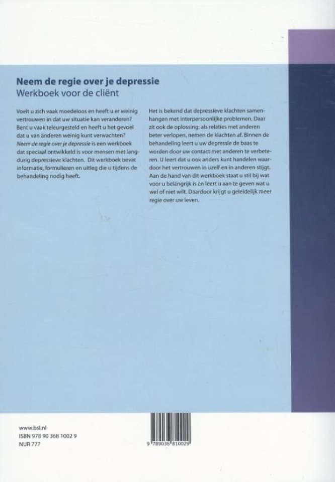 Voelt u zich vaak moedeloos en heeft u er weinig vertrouwen in dat uw situatie kan veranderen? Bent u vaak teleurgesteld en heeft u het gevoel dat u van anderen weinig kunt verwachten? Neem de regie over je depressie is een werkboek dat speciaal ontwikkeld is voor mensen met langdurig depressieve klachten. Dit werkboek bevat informatie, formulieren en uitleg die u tijdens de behandeling nodig heeft.