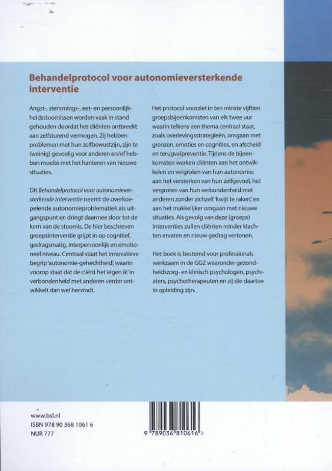 Dit Behandelprotocol voor autonomieversterkende interventie neemt de overkoepelende autonomieproblematiek als uitgangspunt en dringt daarmee door tot de kern van de stoornis. De hier beschreven groepsinterventie grijpt in op cognitief, gedragsmatig, interpersoonlijk en emotioneel niveau. Centraal staat het innovatieve begrip 'autonomie-gehechtheid', waarin voorop staat dat de cliënt het ‘eigen ik’ in verbondenheid met anderen verder ontwikkelt dan wel hervindt.