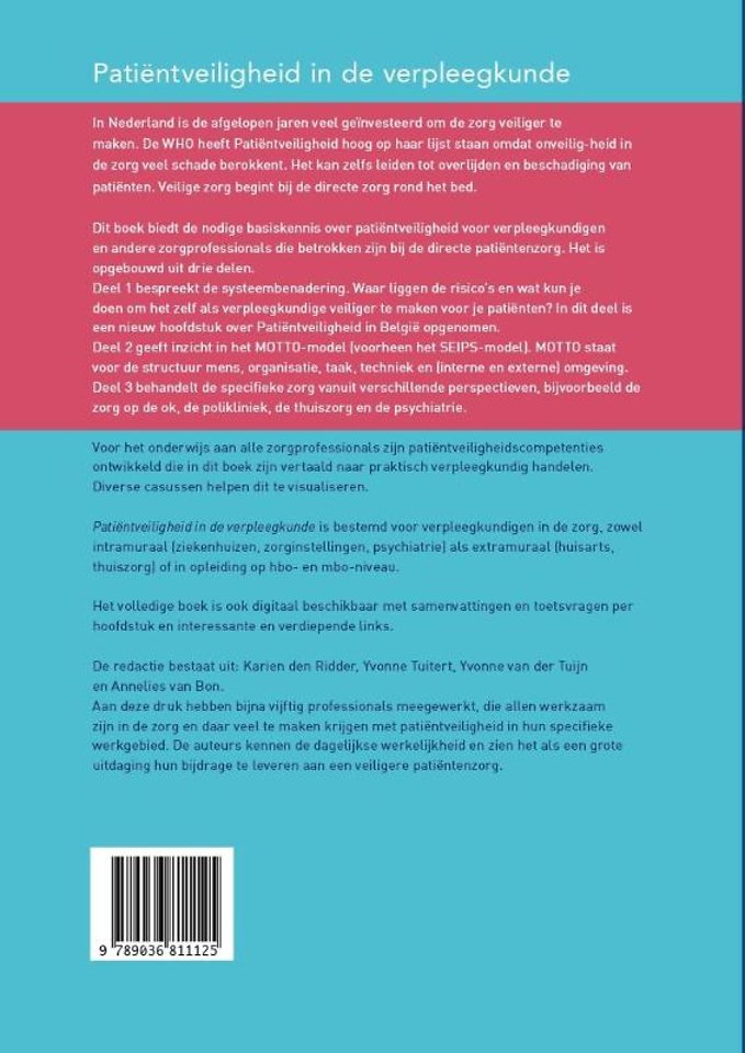 Dit boek biedt de nodige basiskennis over patiëntveiligheid voor verpleegkundigen en andere zorgprofessionals die betrokken zijn bij de directe patiëntenzorg. Het is opgebouwd uit drie delen.