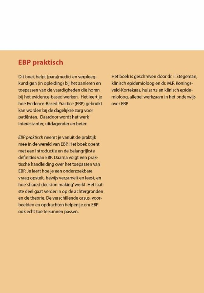 EBP praktisch neemt je vanuit de praktijk mee in de wereld van EBP. Het boek opent met een introductie en de belangrijkste definities van EBP. Daarna volgt een praktische handleiding over het toepassen van EBP. Je leert hoe je een onderzoekbare vraag opstelt, bewijs verzamelt en leest, en hoe ‘shared decision making’ werkt. Het laatste deel gaat verder in op de achtergronden en de theorie. De verschillende casussen, voorbeelden en opdrachten helpen je om EBP ook echt toe te kunnen passen.