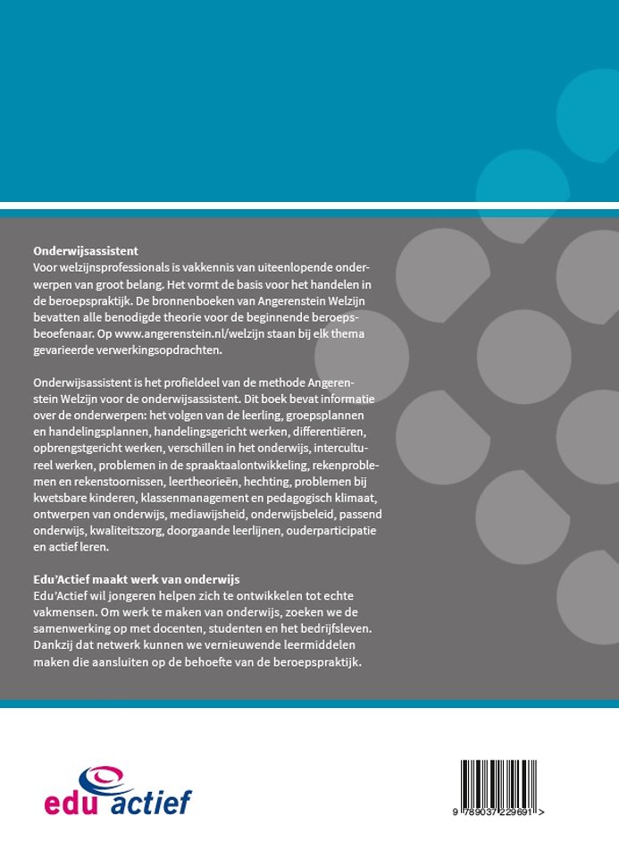 Onderwijsassistent is het profieldeel van de methode Angerenstein Welzijn voor de onderwijsassistent. Dit boek bevat informatie over de onderwerpen: het volgen van de leerling, groepsplannen en handelingsplannen, handelingsgericht werken, differentiëren, opbrengstgericht werken, verschillen in het onderwijs, intercultureel werken, problemen in de spraaktaalontwikkeling, rekenproblemen en rekenstoornissen, leertheorieën, hechting, problemen bij kwetsbare kinderen, klassenmanagement en pedagogisch klimaat, ontwerpen van onderwijs, mediawijsheid, onderwijsbeleid, passend onderwijs, kwaliteitszorg, doorgaande leerlijnen, ouderparticipatie en actief leren.