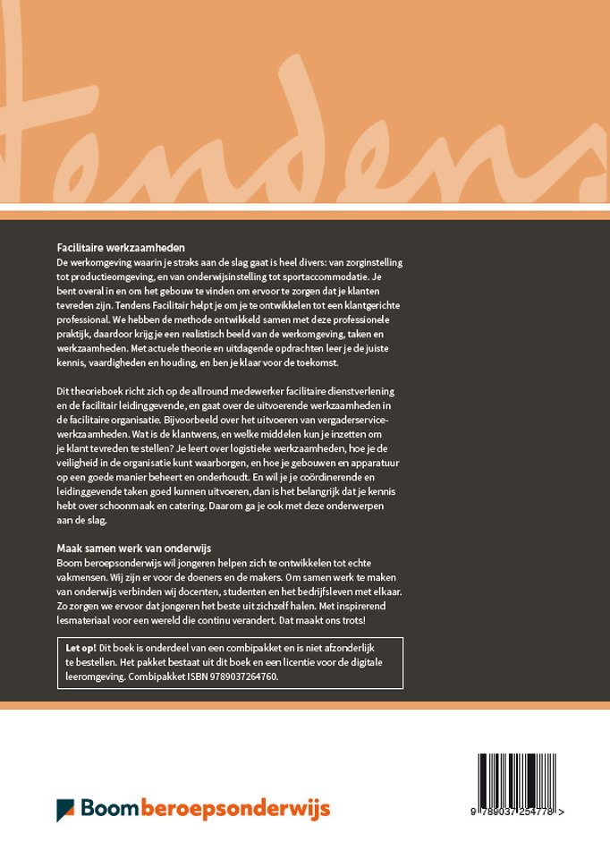 Dit theorieboek richt zich op de allround medewerker facilitaire dienstverlening en de facilitair leidinggevende, en gaat over de uitvoerende werkzaamheden in de facilitaire organisatie. Bijvoorbeeld over het uitvoeren van vergaderservicewerkzaamheden. Wat is de klantwens, en welke middelen kun je inzetten om je klant tevreden te stellen? Je leert over logistieke werkzaamheden, hoe je de veiligheid in de organisatie kunt waarborgen, en hoe je gebouwen en apparatuur op een goede manier beheert en onderhoudt. En wil je je coördinerende en leidinggevende taken goed kunnen uitvoeren, dan is het belangrijk dat je kennis hebt over schoonmaak en catering. Daarom ga je ook met deze onderwerpen aan de slag.