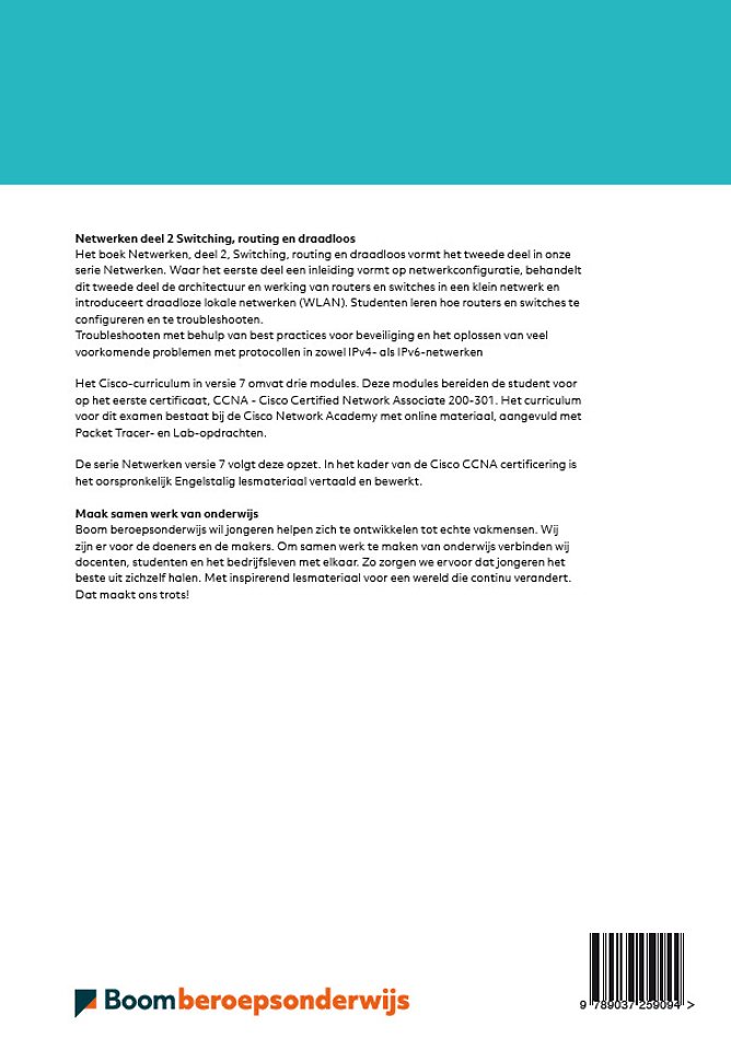 Het boek Netwerken, deel 2, Switching, routing en draadloos vormt het tweede deel in onze serie Netwerken. Waar het eerste deel een inleiding vormt op netwerkconfiguratie, behandelt dit tweede deel de architectuur en werking van routers en switches in een klein netwerk en introduceert draadloze lokale netwerken (WLAN). Studenten leren hoe routers en switches te configureren en te troubleshooten.