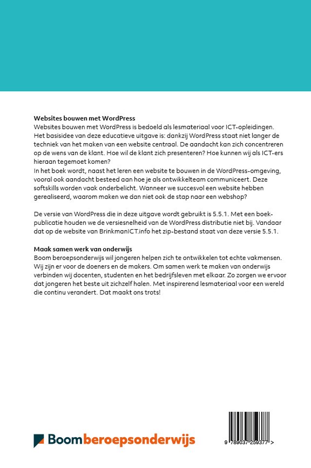 Websites bouwen met WordPress is bedoeld als lesmateriaal voor ICT-opleidingen. Het basisidee van deze educatieve uitgave is: dankzij WordPress staat niet langer de techniek van het maken van een website centraal. De aandacht kan zich concentreren op de wens van de klant. Hoe wil de klant zich presenteren? Hoe kunnen wij als ICT-ers hieraan tegemoet komen?
