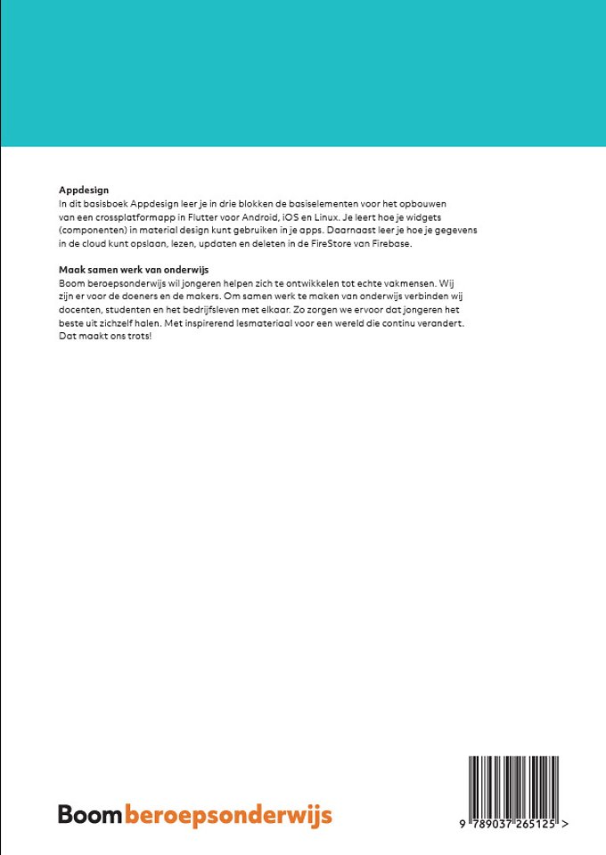 In dit basisboek appdesign leer je in drie blokken de basiselementen voor het opbouwen van een crossplatform app in Flutter voor Android, iOS en Linux. Je leert hoe je widgets (componenten) in material design kan gebruiken in je apps. Daarnaast leer je hoe je gegevens in de cloud kan opslaan, lezen, updaten en deleten in de FireStore van Firebase.