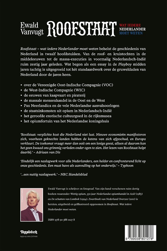 'Roofstaat. Wat iedere Nederlander moet weten' behelst de geschiedenis van Nederland in twaalf hoofdstukken. Van de roof- en kruistochten in de middeleeuwen tot de massa-executies in voormalig Nederlandsch-Indië ruim zestig jaar geleden.Wat begon als een essay in de Playboy midden jaren tachtig is uitgegroeid tot hét standaardwerk over de gruweldaden van Nederland door dejaren heen.