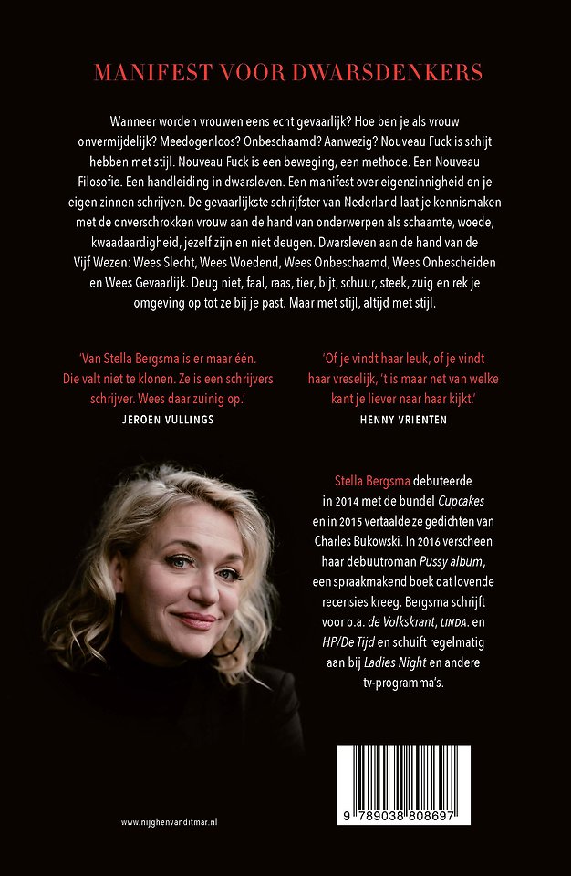 Wanneer worden vrouwen eens echt gevaarlijk? Als ze ophouden met behagen. Alle strikjes van zich afgooien en Nouveau Fuck krijgen, of het zich aanmeten. Nouveau Fuck is een beweging, een levensstijl, een manier van kijken. Aan de hand van het werk van rebelse mensen uit de wereld van literatuur en kunst als Erica Young, Elizabeth Wurtzel, Mona Eltahawy, en Valerie Solanas schrijft Stella Bergsma over onderwerpen als schaamte, woede, kwaadaardigheid, jezelf zijn en wel of niet deugen. Hoe ben je als vrouw onvermijdelijk? Meedogenloos? Nouveau Fuck is een manifest over eigenzinnigheid en je eigen zinnen schrijven.