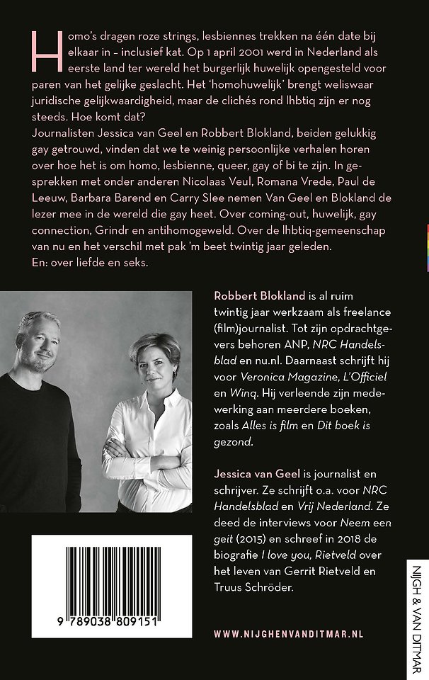 Journalisten Jessica van Geel en Robbert Blokland, beiden gelukkig gay getrouwd, vinden dat we te weinig persoonlijke verhalen horen over hoe het is om homo, lesbienne, queer, gay of bi te zijn. In gesprekken met onder anderen Nicolaas Veul, Romana Vrede, Paul de Leeuw, Barbara Barend en Carry Slee nemen Van Geel en Blokland de lezer mee in de wereld die gay heet. Over coming-out, huwelijk, gay connection, Grindr en antihomogeweld. Over de lhbtiq-gemeenschap van nu en het verschil met pak ’m beet twintig jaar geleden.