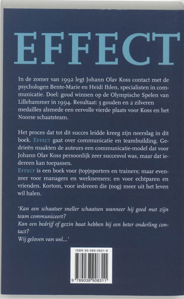 In de zomer van 1992 legt Johann Olav Koss contact met de psychologen Bente-Marie en Heidi Ihlen, specialisten in communicatie. Doel: goud winnen op de Olympische Spelen van Lillehammer in 1994. Resultaat: 3 gouden en 2 zilveren medailles alsmede een eervolle vierde plaats voor Koss en het Noorse Schaatsteam. Het proces dat tot dit succes leidde kreeg zijn neerslag in dit boek. 'Effect' gaat over communicatie en teambuilding. Gedrieën maakten de auteurs een communicatie-model dat voor Johann Olav Koss persoonlijk zeer succesvol was, maar dat iedereen kan toepassen. 'Effect' is een boek voor (top)sporters en trainers; maar evenzeer voor managers en werknemers; en voor echtparen en vrienden. Kortom, voor iedereen die (nog) meer uit het leven wil halen.