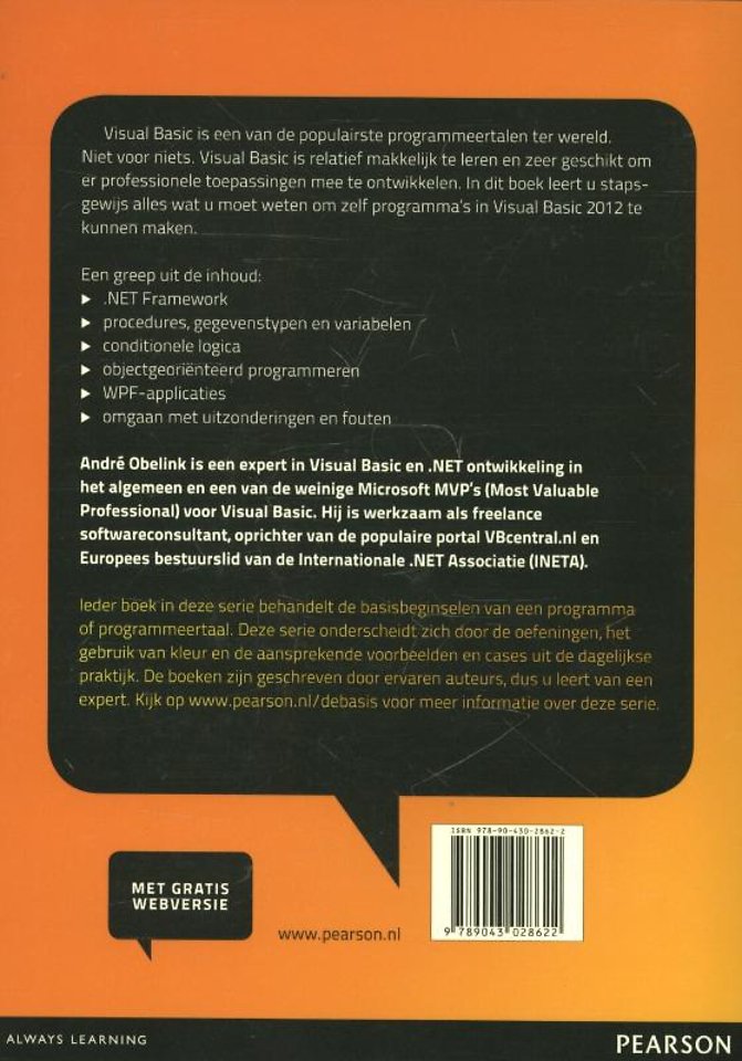 Visual Basic is een van de populairste programmeertalen ter wereld. Niet voor niets. Visual Basic is relatief makkelijk te leren en zeer geschikt om er professionele toepassingen mee te ontwikkelen. In dit boek leert u stapsgewijs alles wat u moet weten om zelf programma's in Visual Basic 2012 te kunnen maken.