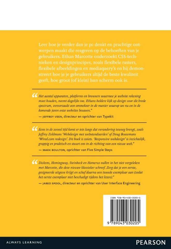 De techniek van responsive webdesign biedt een oplossing om aan die behoeften te voldoen. Auteur en webontwikkelaar Ethan Marcotte kent de ins en outs van deze techniek als geen ander. Hij verkent in dit boek o.a. CSS-technieken en ontwerpbeginselen die zodanig kunnen worden toegepast dat een website reageert op het apparaat waarmee deze wordt bekeken. 'Responsive webdesign' is een must have voor elke web developer die niet achter wil blijven!
