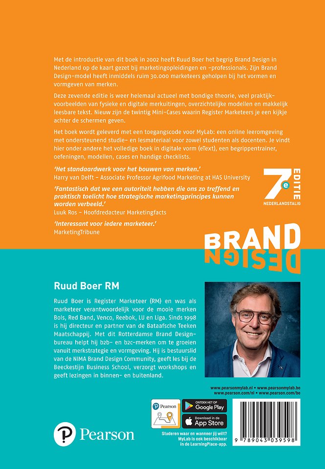 Meer over Ruud BoerMet 20 mini-cases van Register Marketeers Sinds de introductie van dit boek in 2002 is Brand Design, geschreven door brandinggoeroe en Register Marketeer Ruud Boer, een begrip geworden in veel directiekamers en opleidingen. Het bouwen en onderhouden van sterke merken kan niet zonder een relevante mentale merkidentiteit, onderscheidende visuele merkidentiteit en geloofwaardige merkuitingen. Aan de hand van het centrale Brand Design-model wordt de student meegenomen van merkstrategie tot merkactivatie. Door de aansprekende casuïstiek, vele voorbeelden en de heldere schrijfstijl is dit het meest toegankelijke en praktische boek voor studenten en professionals. Bovendien staan op MyLab handige briefingschecklists en bij elk hoofdstuk extra voorbeelden, cases en meerkeuzevragen. Nieuw in deze editie - Van deze nieuwe editie is ook een Engelstalige versie beschikbaar. Voor meer informatie, klik hier. - Twintig (internationale) minicases en één maxicase uit het bedrijfsleven. Al deze cases zijn geschreven door Register Marketeers. - Het centrale Brand Design-model is aangepast. - Meer aandacht voor digital branding. - Meer informatie over onderzoek en Brand Besign voor het mkb en start-ups. - Volledig geactualiseerd. Het boek Brand Design is geschreven voor iedereen die direct of indirect verantwoordelijk is voor merken, of daarvoor wordt opgeleid. Steeds meer hogescholen en universiteiten in Nederland en België realiseren zich dat Brand Design een belangrijk onderdeel vormt van de opleiding en gebruiken daarvoor dit boek. Met de bondige theorie, nuttige modellen (zoals de Merk-Wijzer en het Customer Brand Journey-model) en een rijkdom aan actuele voorbeelden is dit boek breed toepasbaar.