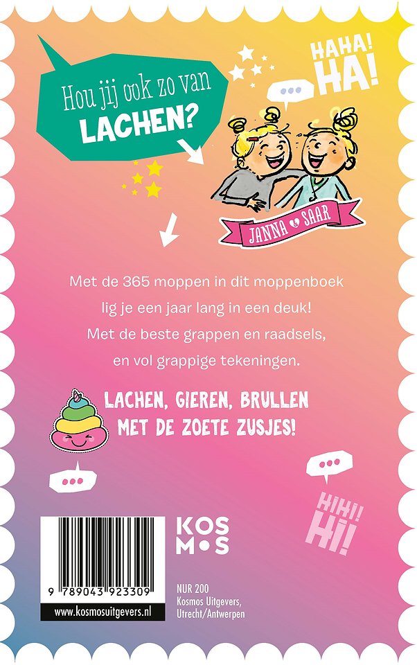 Hou jij ook zo van lachen? Met de 365 moppen in ‘De Zoete Zusjes moppenboek’, geschreven door Hanneke de Zoete, lig je een jaar lang in een deuk. Fans stuurden duizenden moppen op naar de Zoete Zusjes, en dit zijn de 365 allerallerleukste. Een boek vol met de beste grappen, raadsels en met grappige tekeningen van Iris Boter. Voor elke dag is er een goeie grap! Trek je lolbroek aan, want het wordt lachen, gieren en brullen met Janna en Saar.