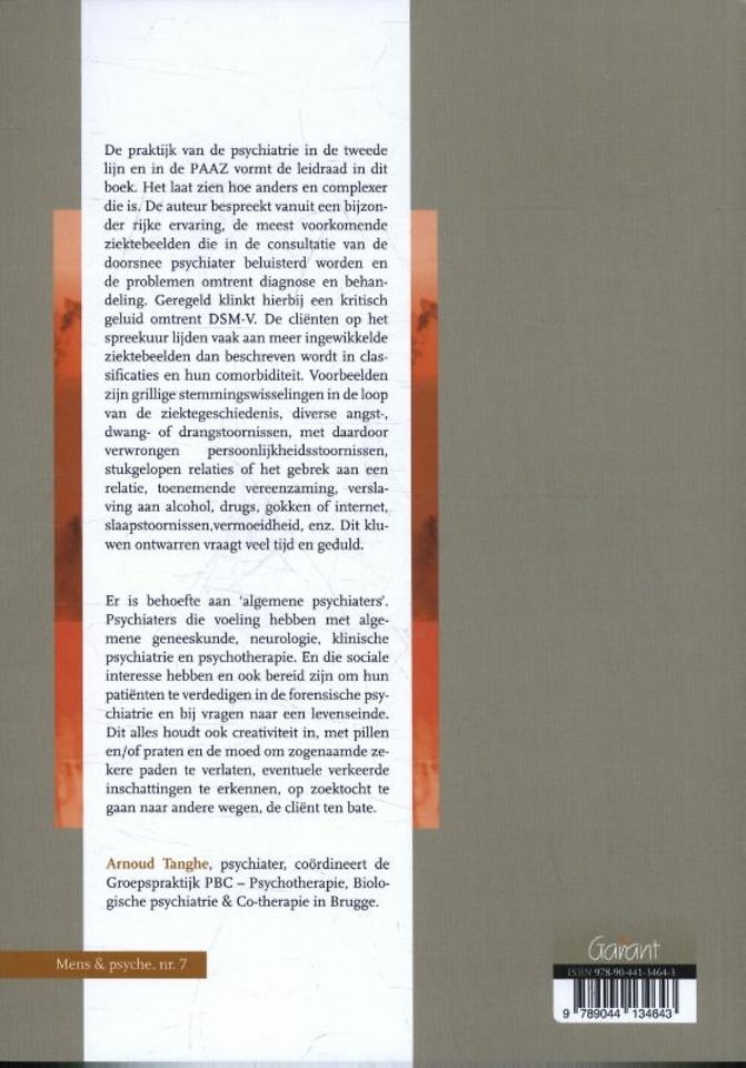 De praktijk van de psychiatrie in de tweede lijn en in de PAAZ vormt de leidraad in dit boek. Het laat zien hoe anders en complexer die is. De auteur bespreekt vanuit een bijzonder rijke ervaring, de meest voorkomende ziektebeelden die in de consultatie van de doorsnee psychiater beluisterd worden en de problemen omtrent diagnose en behandeling. Geregeld klinkt hierbij een kritisch geluid omtrent DSM-V. De cliënten op het spreekuur lijden vaak aan meer ingewikkelde ziektebeelden dan beschreven wordt in classificaties en hun comorbiditeit. Voorbeelden zijn grillige stemmingswisselingen in de loop van de ziektegeschiedenis, diverse angst-, dwang- of drangstoornissen, met daardoor verwrongen persoonlijkheidsstoornissen, stukgelopen relaties of het gebrek aan een relatie, toenemende vereenzaming, verslaving aan alcohol, drugs, gokken of internet, slaapstoornissen,vermoeidheid, enz. Dit kluwen ontwarren vraagt veel tijd en geduld.