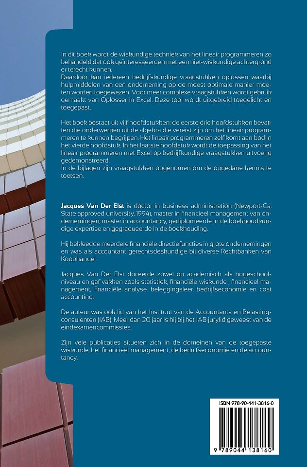 Het boek bestaat uit vijf hoofdstukken: de eerste drie hoofdstukken bevatten die onderwerpen uit de algebra die vereist zijn om het lineair programmeren te kunnen begrijpen. Het lineair programmeren zelf komt aan bod in het vierde hoofdstuk. In het laatste hoofdstuk wordt de toepassing van het lineair programmeren met Excel op bedrijfkundige vraagstukken uitvoerig gedemonstreerd.
