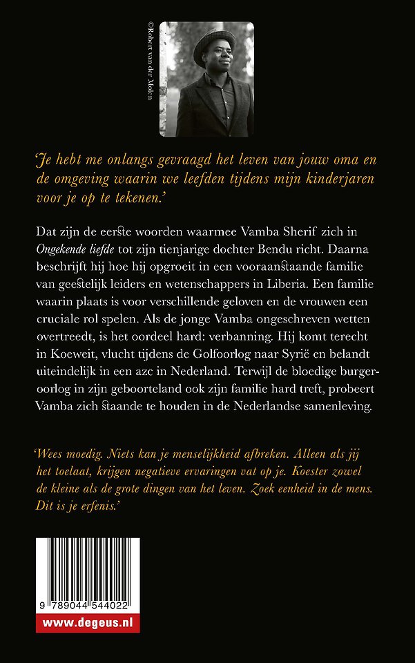 Dat zijn de eerste woorden waarmee Vamba Sherif zich in Ongekende liefde tot zijn tienjarige dochter Bendu richt. Daarna beschrijft hij hoe hij opgroeit in een vooraanstaande familie van geestelijk leiders en wetenschappers in Liberia. Een familie waarin plaats is voor verschillende geloven en de vrouwen een cruciale rol spelen. Als de jonge Vamba ongeschreven wetten overtreedt, is het oordeel hard: verbanning. Hij komt terecht in Koeweit, vlucht tijdens de Golfoorlog naar Syrië en belandt uiteindelijk in een azc in Nederland. Terwijl de bloedige burgeroorlog in zijn geboorteland ook zijn familie hard treft, probeert Vamba zich staande te houden in de Nederlandse samenleving.