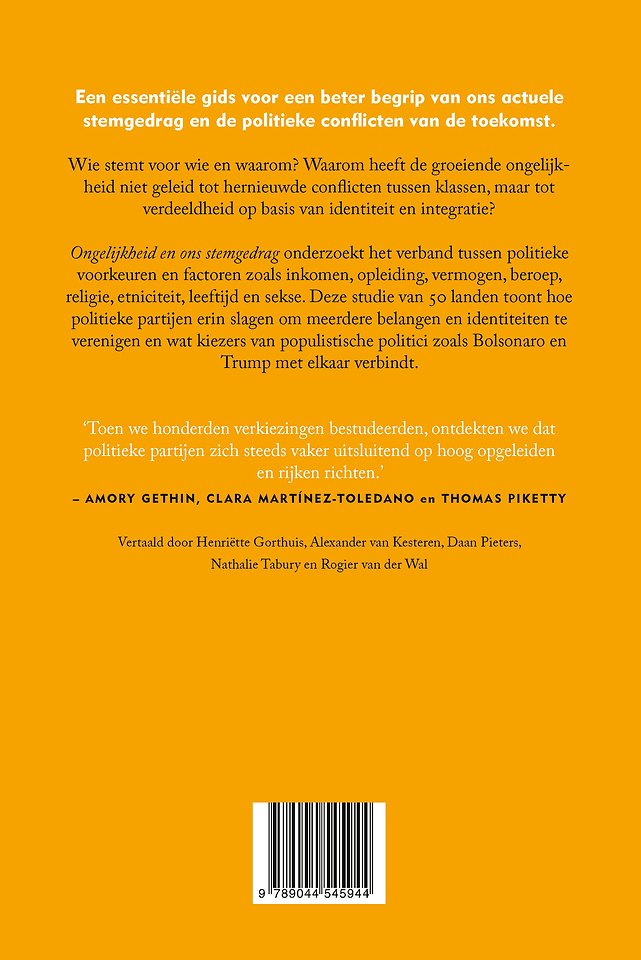 Ongelijkheid en ons stemgedrag onderzoekt het verband tussen politieke voorkeuren en factoren zoals inkomen, opleiding, vermogen, beroep, religie, etniciteit, leeftijd en sekse. Deze studie toont hoe politieke partijen erin slagen om meerdere belangen en identiteiten te verenigen en wat kiezers voor populistische politici, zoals Bolsonaro en Trump, met elkaar verbindt.