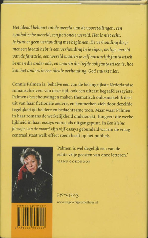 Connie Palmen is, behalve een van de belangrijkste Nederlandse romanschrijvers van deze tijd, ook een uiterst begaafd essayiste. Palmens beschouwingen maken thematisch onlosmakelijk deel uit van haar fictionele oeuvre, en kenmerken zich door dezelfde tegelijkertijd heldere en bedachtzame toon. Maar waar Palmen in haar romans de werkelijkheid onderzoekt, fungeert die werkelijkheid in haar essays vooral als uitgangspunt. In Een kleine filosofie van de moord zijn vijf essays gebundeld waarin de vraag centraal staat welk effect roem heeft op het publiek.