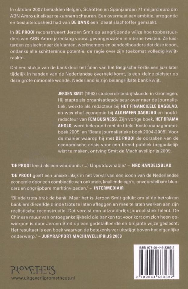 In 'De prooi' reconstrueert Jeroen Smit op aangrijpende wijze hoe topbestuurders van ABN Amro jarenlang vooral gevangenzaten in interne twisten. Ze luisterden zo slecht naar de klanten, werknemers en aandeelhouders dat deze icoon, ondanks alle schitterende potentie, de regie over zijn toekomst volledig kwijtraakte.