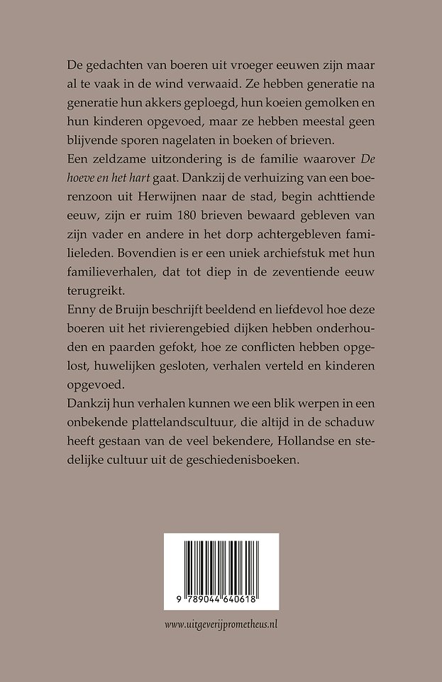 Enny de Bruijn beschrijft beeldend en liefdevol hoe deze boeren uit het rivierengebied dijken hebben onderhouden en paarden gefokt, hoe ze conflicten hebben opgelost, huwelijken gesloten, verhalen verteld en kinderen opgevoed.