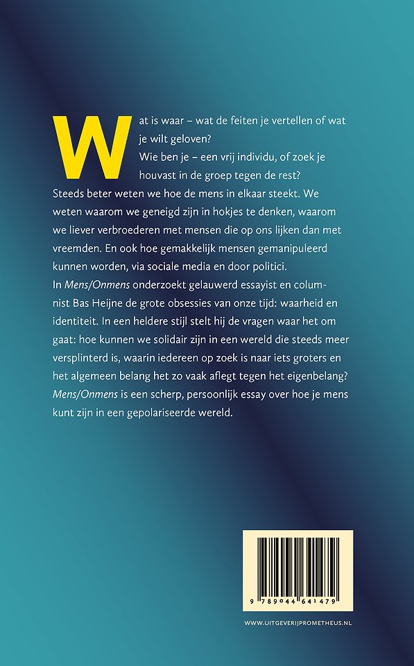 In 'Mens/Onmens' onderzoekt gelauwerd essayist en columnist Bas Heijne de twee grote obsessies van onze tijd: waarheid en identiteit. In een heldere stijl stelt hij de vragen waar het om gaat: hoe kunnen we solidair zijn in een wereld die steeds meer versplinterd is, waarin iedereen op zoek is naar iets groters en het algemeen belang het zo vaak aflegt tegen het eigenbelang?
