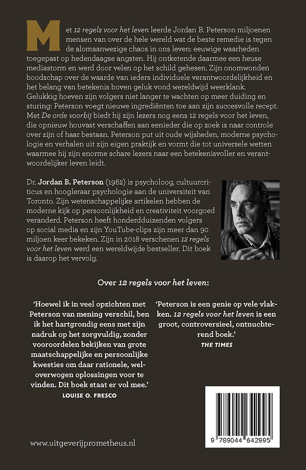 Meer over Jordan PetersonMet 12 regels voor het leven leerde Jordan B. Peterson miljoenen mensen van over de hele wereld wat de beste remedie is tegen de alom aanwezige chaos in ons leven: eeuwige waarheden toegepast op hedendaagse angsten. Hij ontketende daarmee een heuse mediastorm en werd door velen op het schild gehesen. Zijn onomwonden boodschap over de waarde van ieders individuele verantwoordelijkheid en het belang van betekenis boven geluk vond wereldwijd weerklank.