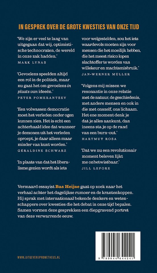 Voor NRC Handelsblad ging vermaard essayist Bas Heijne op zoek naar het verhaal achter het dagelijkse rumoer en de krantenkoppen. Hij sprak met denkers en wetenschappers (onder andere Peter Pomerantsev, Angela Saini, Elaine Pagels, Martin Hägglund en Géraldine Schwarz) over grote kwesties die het debat in onze tijd bepalen.