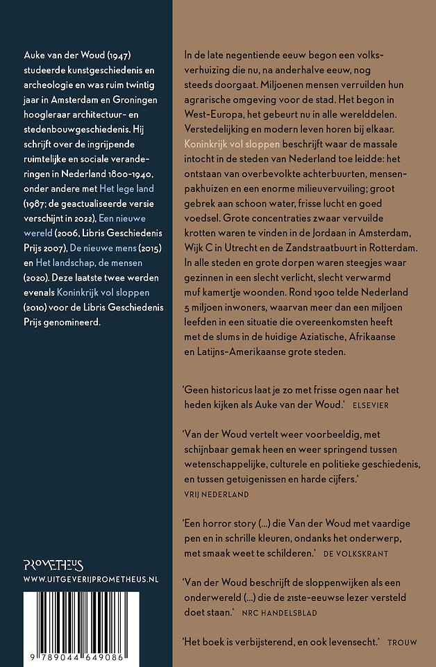 Auke van der Woud (1947) studeerde kunstgeschiedenis en archeologie en was ruim twintig jaar in Amsterdam en Groningen hoogleraar architectuur- en stedenbouwgeschiedenis. Hij schrijft over de ingrijpende ruimtelijke en sociale veranderingen in Nederland 1800-1940, onder andere met Het lege land (1987; de geactualiseerde versie verschijnt in 2022), Een nieuwe wereld (2006, Libris Geschiedenisprijs 2007), De nieuwe mens (2015) en Het landschap, de mensen (2020). Deze laatste twee werden evenals Koninkrijk vol sloppen (2010) voor de Libris Geschiedenisprijs genomineerd.