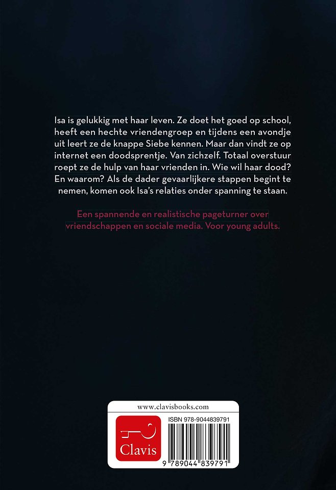 Isa is gelukkig met haar leven. Ze doet het goed op school, heeft een hechte vriendengroep en tijdens een avondje uit leert ze de knappe Siebe kennen. Maar dan vindt ze op het internet een doodsprentje. Van zichzelf. Totaal overstuur roept ze de hulp van haar vrienden in. Wie wil haar dood? En waarom? Als de dader gevaarlijkere stappen begint te nemen, komen ook Isa's relaties onder spanning te staan.