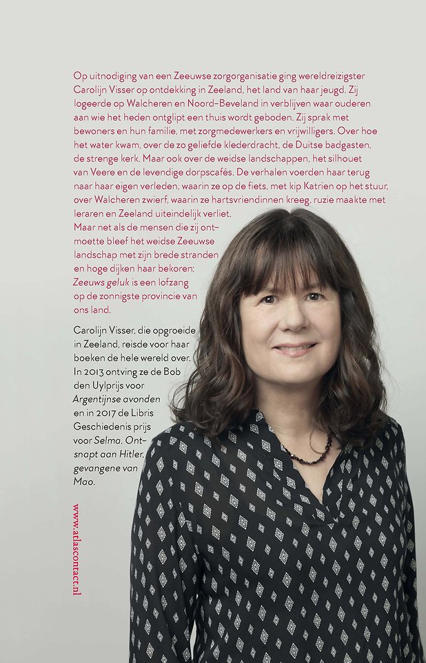 Op uitnodiging van een Zeeuwse zorgorganisatie schreef wereldreizigster Carolijn Visser ‘Zeeuws geluk’, een boek over Zeeland, het land van haar jeugd. Zij logeerde op Walcheren en Noord-Beveland in verblijven waar ouderen aan wie het heden ontglipt een thuis wordt geboden. Zij sprak met bewoners en hun familie, met zorgmedewerkers en vrijwilligers. Over hoe het water kwam, over de zo geliefde klederdracht, de Duitse badgasten, de strenge kerk. Maar ook over de weidse landschappen, het silhouet van Veere en de levendige dorpscafés.