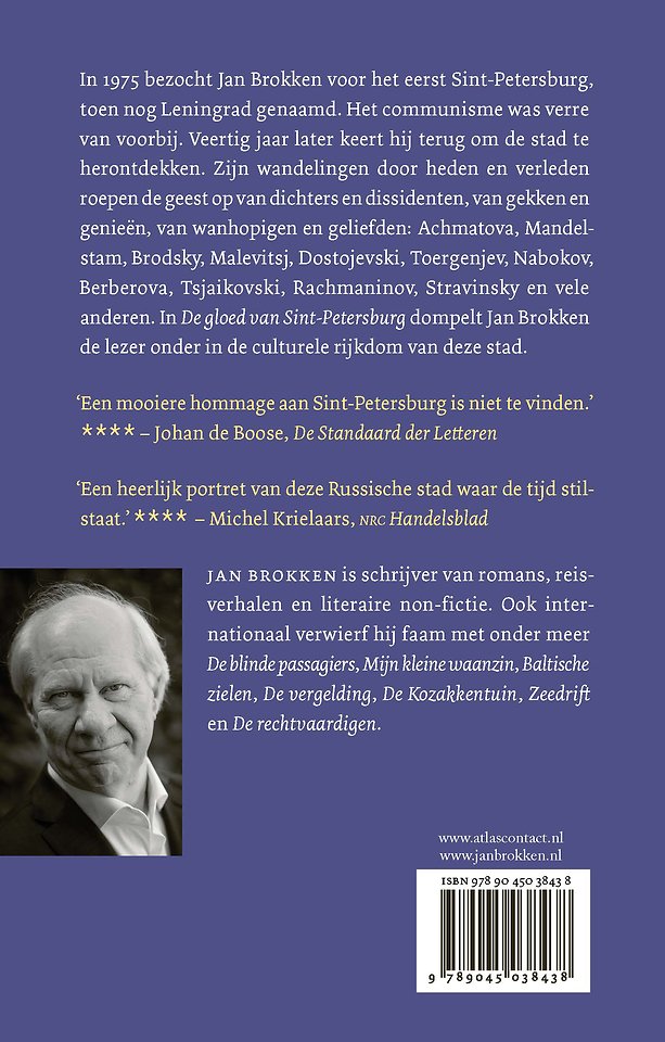 De gloed van Sint Petersburg van Jan Brokken is onmiskenbaar zijn mooiste boek. Zijn wandelingen door de stad roepen de geest op van dichters en dissidenten, van gekken en genieën, van wanhopigen en geliefden, van Anna Achmatova, Osip en Nadjezjda Mandelstam, Joseph Brodski, Dostojevski, Toergenjev, Nabokov en vele anderen. ‘Ik dwaal nog één keer door de stad. De mist trekt langzaam op. Het vriest niet meer maar het voelt kouder dan toen het min tien was, ik word ingehaald door haastige mensen, op weg naar een warm metrostation of een trolleybus. Ik neem een brede straat en dan een smalle, ik loop langs de bochtige Mojka en herinner me een gedicht van Achmatova: De een loopt in een rechte baan / De ander loopt in kringen / En wacht om weer naar huis te gaan, / Naar vroegere beminden. / En ik – rampzalig en berooid, / Ik loop in zigzaglijnen, / Ik ga naar nergens en naar nooit, / Zoals ontspoorde treinen. Alles in deze stad stemt tot kijken, nadenken, herinneren, de melancholie is alom. Ware Sint-Petersburg er niet geweest, dan had ik de aan de rivier sluimerende stad zelf uitgevonden, als een humeur dat voor eeuwig bij me past.’