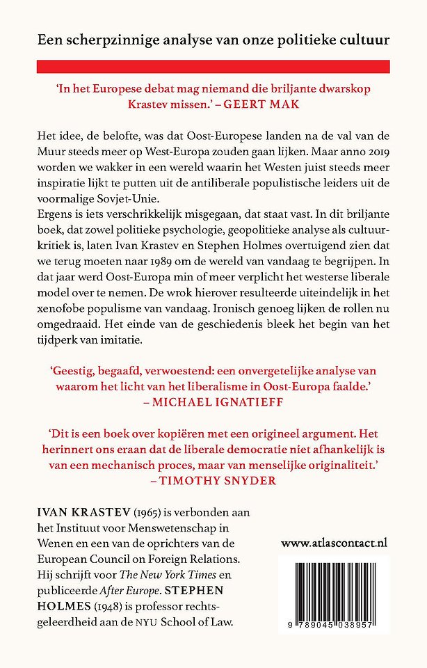 In Falend licht, dat zowel politieke psychologie, geopolitieke analyse als cultuurkritiek is, laten Ivan Krastev en Stephen Holmes overtuigend zien dat we terug moeten naar 1989 om de wereld van vandaag te begrijpen. In dat jaar werd Oost-Europa min of meer verplicht het westerse liberale model over te nemen. De uiteindelijke wrok hierover resulteerde in het xenofobe populisme van vandaag. Ironisch genoeg lijken de rollen nu omgedraaid. Het einde van de geschiedenis bleek het begin van het tijdperk van imitatie.