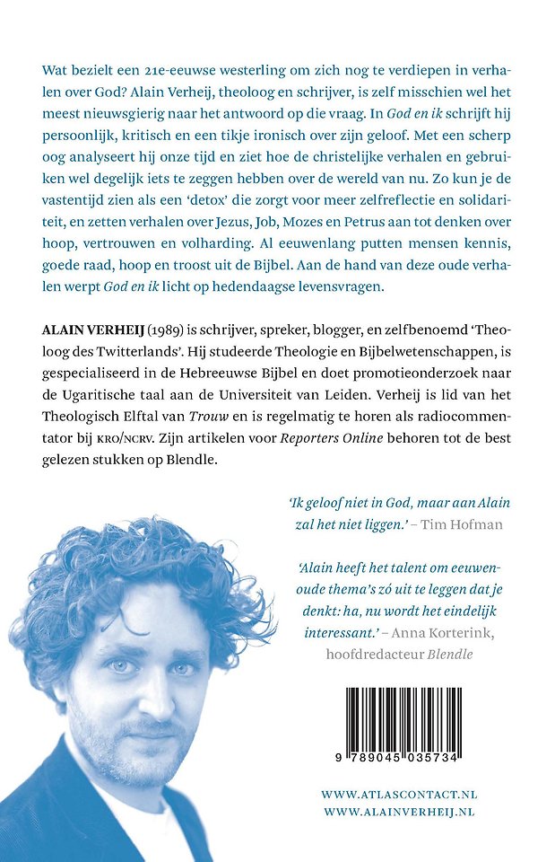 God en ik van theoloog en schrijver Alain Verheij neemt de volgende vraag als uitgangspunt: wat bezielt een 21e-eeuwse westerling om zich nog te verdiepen in verhalen over God? Verheij is zelf misschien wel het meest nieuwsgierig naar het antwoord op die vraag. In God en ik schrijft hij persoonlijk, kritisch en een tikje ironisch over zijn geloof. Met een scherp oog analyseert hij onze tijd en ziet hoe de christelijke verhalen en gebruiken wel degelijk iets te zeggen hebben over de wereld van nu. Zo kun je de vastentijd zien als een ‘detox’ die zorgt voor meer zelfreflectie en solidariteit, en zetten verhalen over Jezus, Job, Mozes en Petrus aan tot denken over hoop, vertrouwen en volharding. Al eeuwenlang putten mensen kennis, goede raad, hoop en troost uit de Bijbel. Aan de hand van deze oude verhalen werpt God en ik licht op hedendaagse levensvragen.