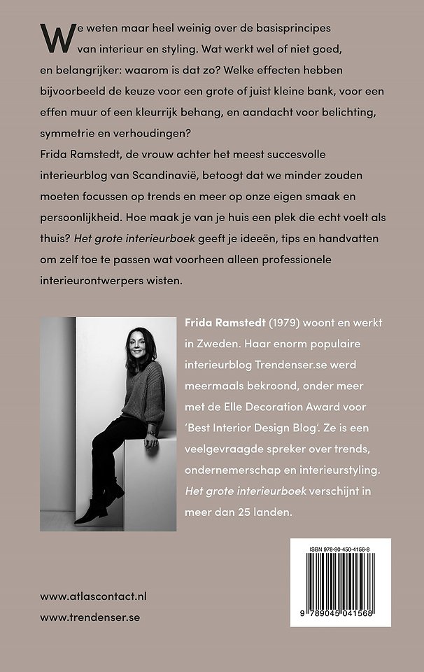 ‘Het grote interieurboek’ van Frida Ramstedt is dé gids bij het inrichten van je huis.We weten maar heel weinig over de basisprincipes van interieur en styling. Wat werkt wel of niet goed, en belangrijker: waarom is dat zo? Welke effecten hebben bijvoorbeeld de keuze voor een grote of juist kleine bank, voor een effen muur of een kleurrijk behang, en aandacht voor belichting, symmetrie en verhoudingen?