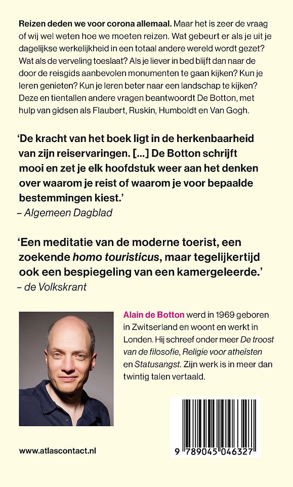 In ‘De kunst van het reizen’ houdt Alain de Botton zich bezig met de vraag of wij wel weten hoe we moeten reizen. Reizen deden we voor corona namelijk allemaal. Wat gebeurt er als je uit je dagelijkse werkelijkheid in een totaal andere wereld wordt gezet? Wat als de verveling toeslaat? Als je liever in bed blijft dan naar de door de reisgids aanbevolen monumenten te gaan kijken? Kun je leren genieten? Kun je leren beter naar een landschap te kijken? Deze en tientallen andere vragen beantwoordt De Botton, met hulp van gidsen als Flaubert, Ruskin, Humboldt en Van Gogh.