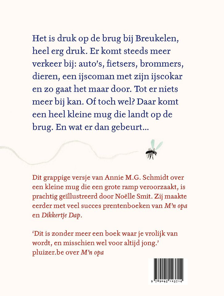 Vrolijk versje van Annie M.G. Schmidt over een kleine mug die een grote ramp veroorzaakt in het verkeer. Geïllustreerd door Noëlle Smit, die eerder van ‘Dikkertje Dap’ en ‘M’n opa’ succesvolle prentenboeken maakte.