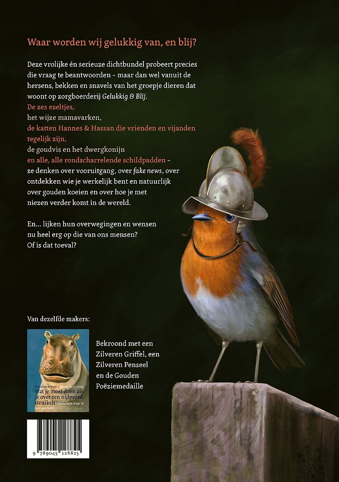 De katten Hannes en Hassan, de ezeltjes, de schildpadden, het mamavarken met haar biggetjes, het dwergkonijn en de goudvis, de vogels: ze leven gelukkig en blij op de boerderij. Hoe voorspelbaarder hun dagen zijn, hoe liever het ze is. Maar soms wordt hun rustige bestaan opgeschud en zit er niets anders op dan wennen aan iets nieuws. Toch blijkt geluk vaak heel dichtbij!