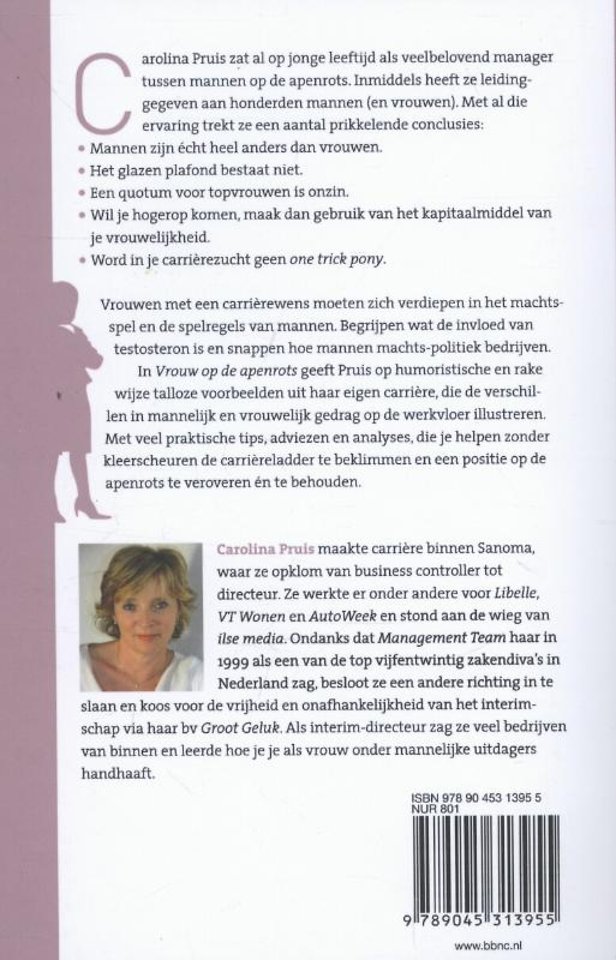 Meer over Carolina PruisCarolina Pruis zat al op jonge leeftijd als veelbelovende manager tussen de mannen op de apenrots. Inmiddels heeft ze leiding gegeven aan honderden mannen (en vrouwen). Met al die ervaring trekt ze een aantal prikkelende conclusies.