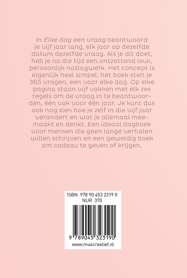 In 'Elke dag een vraag' beantwoord je vijf jaar lang, elk jaar op dezelfde datum dezelfde vraag. Als je dit doet, heb je na die tijd een ontzettend leuk en persoonlijk naslagwerk. Het concept is eigenlijk heel simpel: het boek stelt je 365 vragen, een voor elke dag. Op elke pagina staan vijf vakken met elk zes regels om de vraag in te beantwoorden, één vak voor één jaar. Je kunt dus ook nog zien hoe je zelf in die vijf jaar verandert en wat je allemaal meemaakt en denkt. Een ideaal dagboek voor mensen die geen lange verhalen willen schrijven en een geweldig boek om cadeau te geven of krijgen.