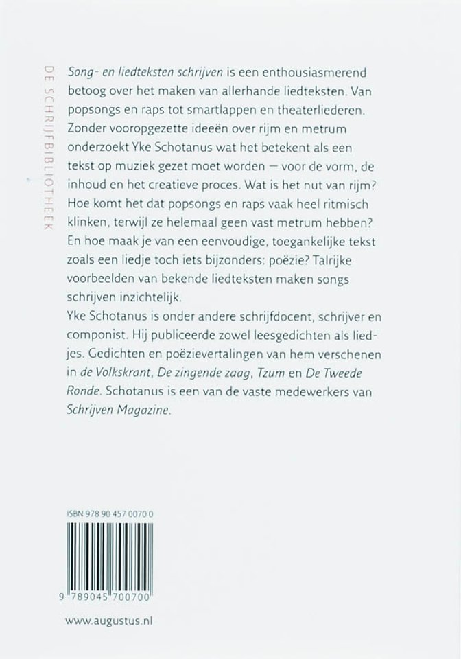 Song- en liedteksten schrijven is een enthousiasmerend betoog over het maken van allerhande liedteksten. Van popsongs en raps tot smartlappen en theaterliederen. Zonder vooropgezette ideeën over rijm en metrum onderzoekt Yke Schotanus wat het betekent als een tekst op muziek gezet moet worden - voor de vorm, de inhoud en het creatieve proces. Wat is het nut van rijm? Hoe komt het dat popsongs en raps vaak heel ritmisch klinken, terwijl ze helemaal geen vast metrum hebben? En hoe maak je van een eenvoudige, toegankelijke tekst zoals een liedje toch iets bijzonders: poëzie? Talrijke voorbeelden van bekende liedteksten maken songs schrijven inzichtelijk.