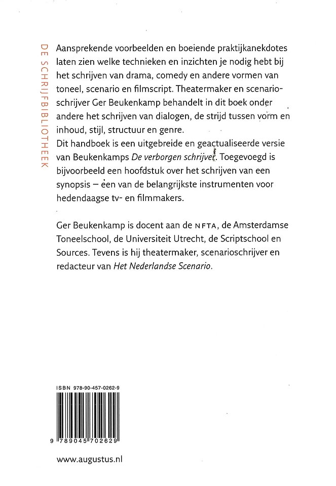 Aansprekende voorbeelden en boeiende praktijkanekdotes laten zien welke technieken en inzichten je nodig hebt bij het schrijven van drama, comedy en andere vormen van toneel, scenario en fi lmscript. Theatermaker en scenarioschrijver Ger Beukenkamp behandelt in dit boek onder andere het schrijven van dialogen, de strijd tussen vorm en inhoud, stijl, structuur en genre. Dit handboek is een uitgebreide en geactualiseerde versie van Beukenkamps De verborgen schrijver. Toegevoegd is onder andere een hoofdstuk over het schrijven van een synopsis ¿ een van de belangrijkste instrumenten voor hedendaagse tv- en fi lmmakers