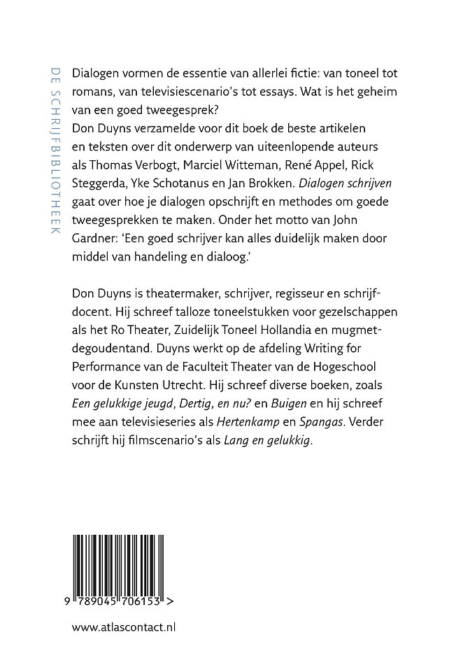 Dialogen vormen de essentie van allerlei fictie: van toneel tot romans, van televisiescenarios tot essays. Wat is het geheim van een goed tweegesprek? Theaterauteur en regisseur Don Duyns verzamelde voor dit boek de beste artikelen en teksten op dit gebied van uiteenlopende auteurs als Thomas Verbogt, Marciel Witteman, René Appel, Rick Steggerda, Yke Schotanus en Jan Brokken. Dialogen schrijven gaat over dialogen in toneel, romans en verhalen, soaps, stripverhalen en essays; over hoe je dialogen opschrijft en methodes om goede tweegesprekken te maken. Onder het motto van John Gardner: 'Een goed schrijver kan alles duidelijk maken door middel van handeling en dialoog.'