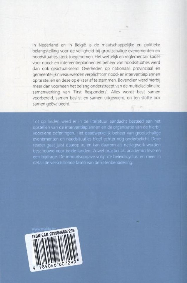 Tot op heden werd er in de literatuur aandacht besteed aan het opstellen van de interventieplannen en de organisatie van de hierbij voorziene oefeningen. Het daadwerkelijk beheer van grootschalige evenementen en noodsituaties bleef echter nog onderbelicht. Deze reader gaat juist daarop in, en kan daarom als naslagwerk worden beschouwd voor beide landen. Zowel practici als academici leveren een bijdrage. De inhoudsopgave volgt de beleidscyclus, en meer in detail de verschillende fasen van de ketenbenadering.