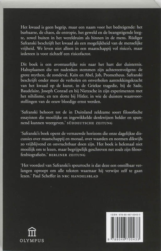 'Het kwaad' is geen begrip schrijft Rüdiger Safranski, maar een naam voor het bedreigende: het barbaarse, de chaos, de entropie, het geweld en de beangstigende leegte, zowel buiten in het wereldruim als binnen in de mens. Safranski beschrijft het kwaad als een mogelijkheid van de menselijke vrijheid. We leven niet alleen in een maatschappij vol risico’s, maar iedereen is voor zichzelf een risicofactor. Dit boek is een avontuurlijke reis naar het hart der duisternis. Halteplaatsen die tot nadenken stemmen zijn achtereenvolgens: de grote mythen, de zondeval, Kaïn en Abel, Job, Prometheus. Safranski beschrijft onder meer de verholen en onverholen aantrekkingskracht van het kwaad op de kunst, in de Griekse tragedie, bij de Sade, Baudelaire, Joseph Conrad en bij Nietzsche in zijn experimenten met het nihilisme, en ten slotte bij Hitler, in wie de duistere waanvoorstellingen van de eeuw bloedige ernst werden.