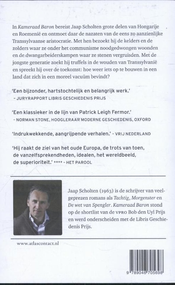 In Kameraad Baron bereist Jaap Scholten grote delen van Hongarije en Roemenië, en ontmoet daar de nazaten van de eens zo aanzienlijke Transsylvaanse aristocratie. Met hen bezoekt hij de kelders en de zolders waar ze onder het communisme noodgedwongen woonden en de dwangarbeiderskampen waar ze stenen vergruisden. Met de jongste generatie zoekt hij truffels in de wouden van Transsylvanië en spreekt hij over de toekomst: hoe weer iets op te bouwen in een land dat zich in een moreel vacuüm bevindt? Kameraad Baron is het onwaarschijnlijke verhaal van de bijna uitgeroeide aristocratie en hun geschiedenis. En het besef dat die geschiedenis niet los te zien is van de huidige stand van zaken in Oost Europa.