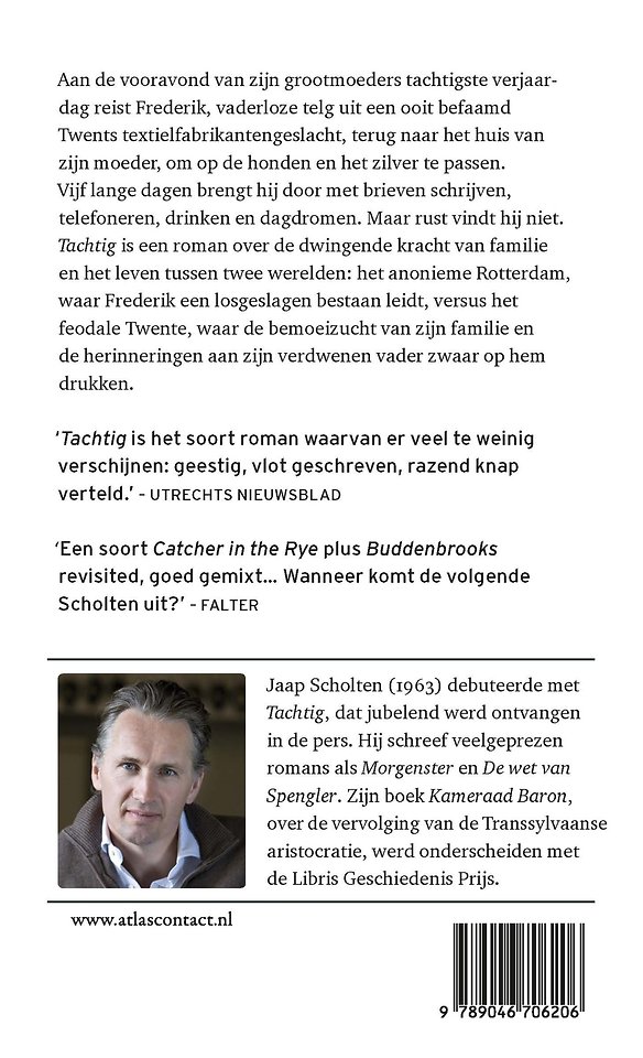 In ‘Tachtig’ van Jaap Scholten reist Frederik, vaderloze telg uit een ooit befaamd Twents textielfabrikantengeslacht, aan de vooravond van zijn grootmoeders tachtigste verjaardag terug naar het huis van zijn moeder, om op de honden en het zilver te passen. Vijf lange dagen brengt hij door met brieven schrijven, telefoneren, drinken en dagdromen. Maar rust vindt hij niet. Tachtig is een roman over de dwingende kracht van familie en het leven tussen twee werelden: het anonieme Rotterdam, waar Frederik een losgeslagen bestaan leidt, versus het feodale Twente, waar de bemoeizucht van zijn familie en de herinneringen aan zijn verdwenen vader zwaar op hem drukken.