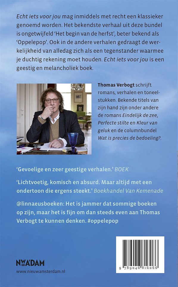 Thomas Verbogt enkele nieuwe verhalen die hij onlangs schreef. Echt iets voor jou is het ideale cadeau: een onvergetelijke bundel vol lichtvoetige, komische en vaak absurde verhalen.